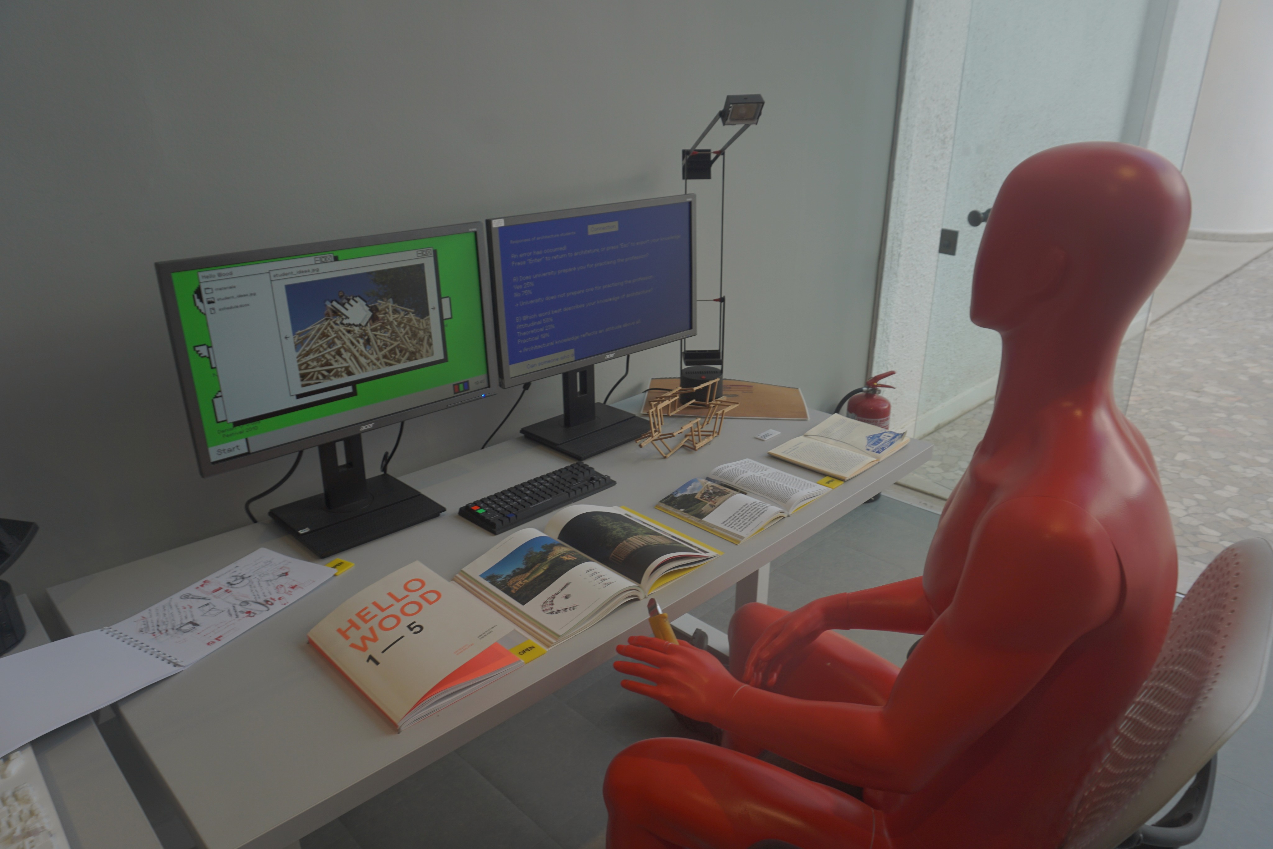 The content is divided into an RGB color scheme: red for participants, green for their projects, and blue for student surveys that reflect on the current state of architectural education in Hungary. Together, the pavilion reveals the adaptability of architectural thinking and its relevance far beyond conventional practice.